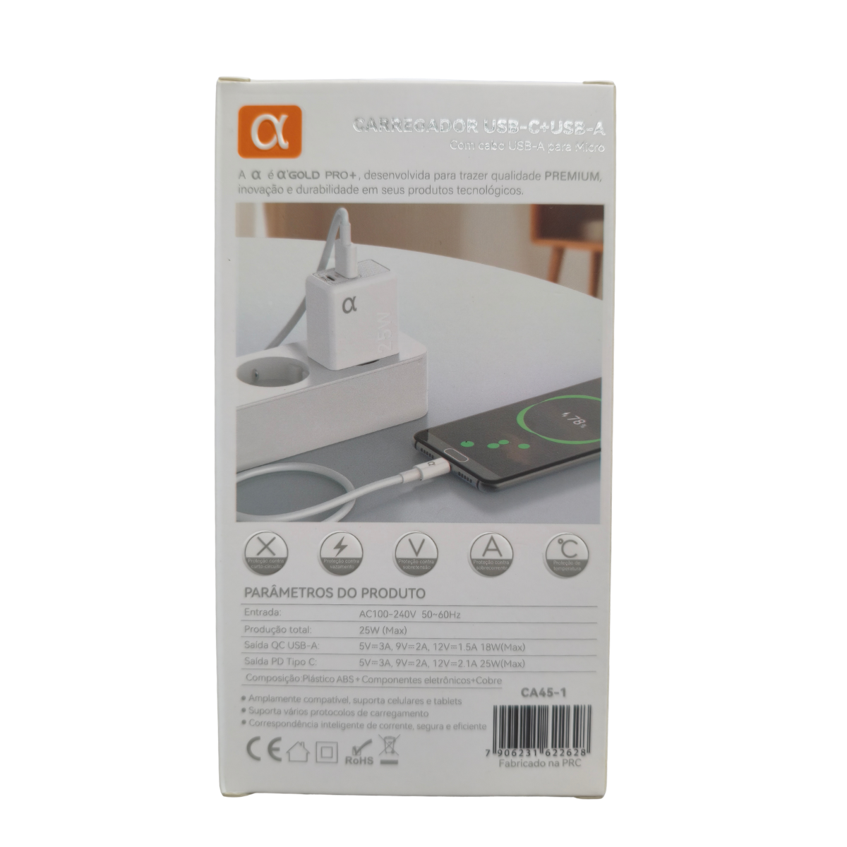 O A’Gold CA45-1 não é um carregador comum. Ele vem equipado com duas saídas de alta performance para atender a todas as suas necessidades: uma porta USB-C (Power Delivery) de até 25W e uma porta USB-A (Quick Charge) de até 18W.